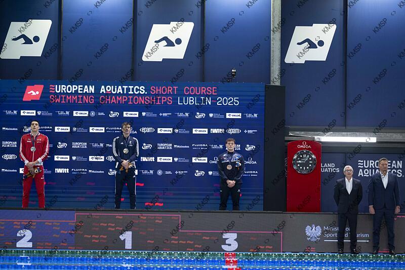 Maximle Grousset (FRA) celebrates his Gold medal on Men’s 100 m Freestyle on Podium ceremony during the European Aquatics Swimming Short Course Championships, at the Aqua Lublin Center in Lublin, Poland, on December 6, 2025. Photo Stephane Kempinaire/KMSP