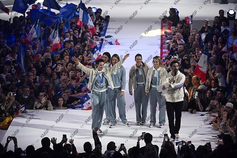 The french Alpine skiing athletes Romane Miradoli, Doriane Escane, Marie Lamure, Clara Direz and Camille Cerutti parade during the return of the French delegation from the Olympic Winter Games Milano Cortina 2026, in Albertville, France, on February 23, 2026, Photo Jean-Marie Hervio / KMSP