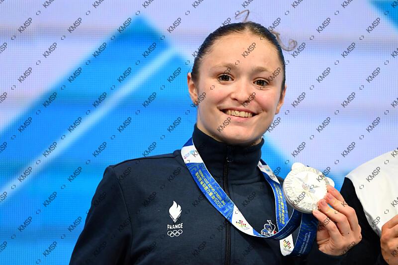 Candy Briere-Vetillard (FRA) poses on the podium after winning the silver medal in Trampoline Gymnastics, Women's Tumbling Final, in Chengdu, Republic of China, on August 09, 2025, Photo Philippe Millereau / KMSP