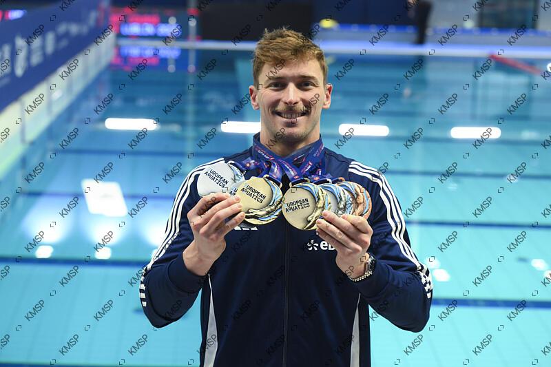 Maxime Grousset (FRA) poses with their medals ( 1 Bronze medal, 3 Silver medals, 2 Gold medals) at the end of the competition during the European Aquatics Swimming Short Course Championships, at the Aqua Lublin Center in Lublin, Poland, on December 7, 2025. Photo Stephane Kempinaire/KMSP
