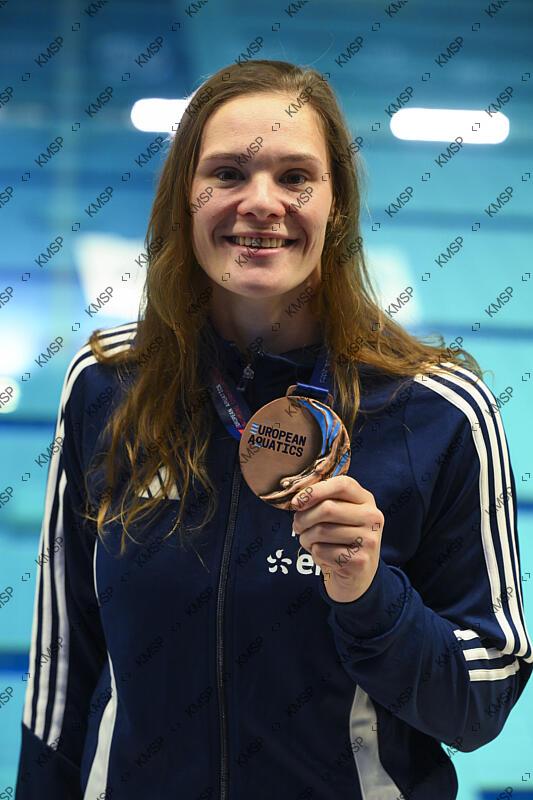 Pauline Mahieu (FRA) poses with her Bronze medal at the end of the competition during the European Aquatics Swimming Short Course Championships, at the Aqua Lublin Center in Lublin, Poland, on December 7, 2025. Photo Stephane Kempinaire/KMSP