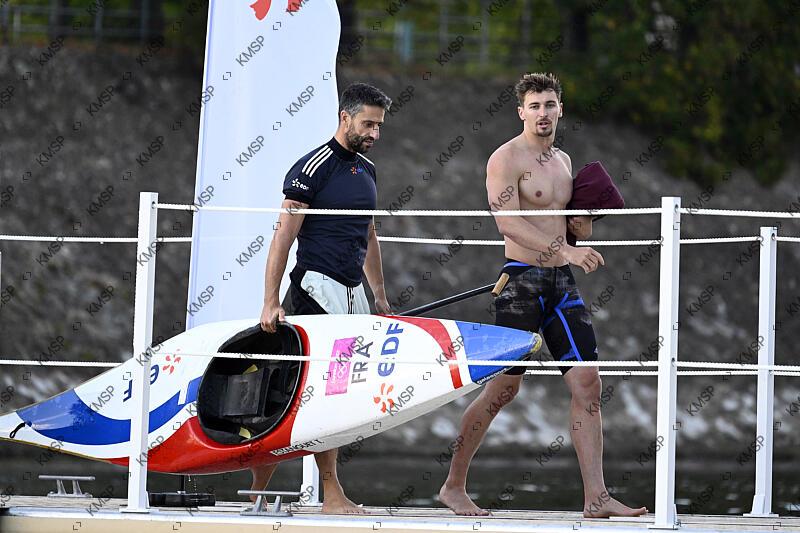 Former Paris 2024 Games President Tony Estanguet and french swimmer Maxime Grousset participate in a challenge during the french national sport celebration day on Rivoli street in Paris on September 14, 2025. Photo Jean-Marie Hervio / KMSP