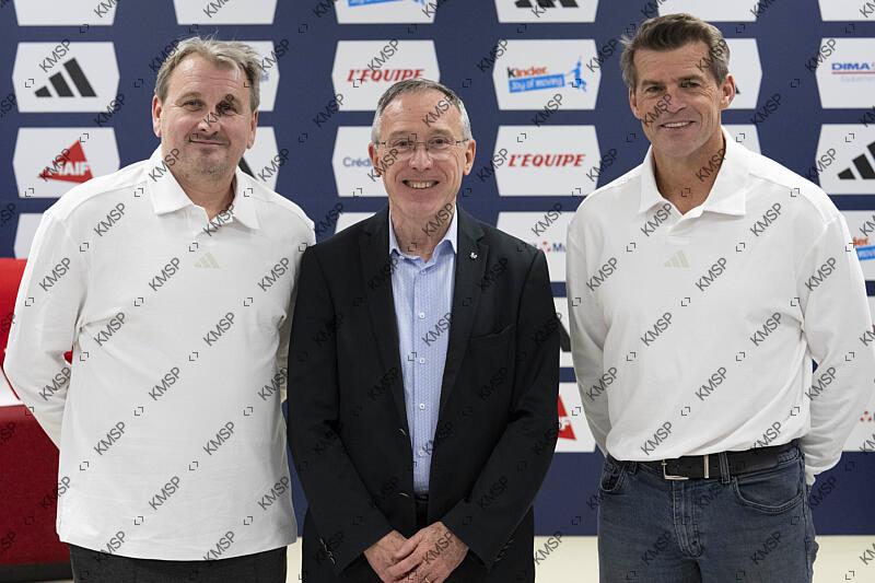 Press conference for hight performance project with Frank Bignet, National Technical director of the French Athletics Federation, Jean Gracia President of the French Athletics Federation and Jean Galfione manager for L.A programme in Paris, France, on December 16, 2025. Photo Stephane Kempinaire/KMSP