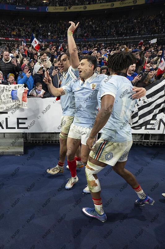 Mickael Guillard, Louis Bielle-Biarrey and Theo Attissogbe for France celebrate the victory with the Trophy during the Six Nations Rugby Union match France against England at the Stade de France, in Saint-Denis on March 14, 2026, Photo Stephane Kempinaire / KMSP