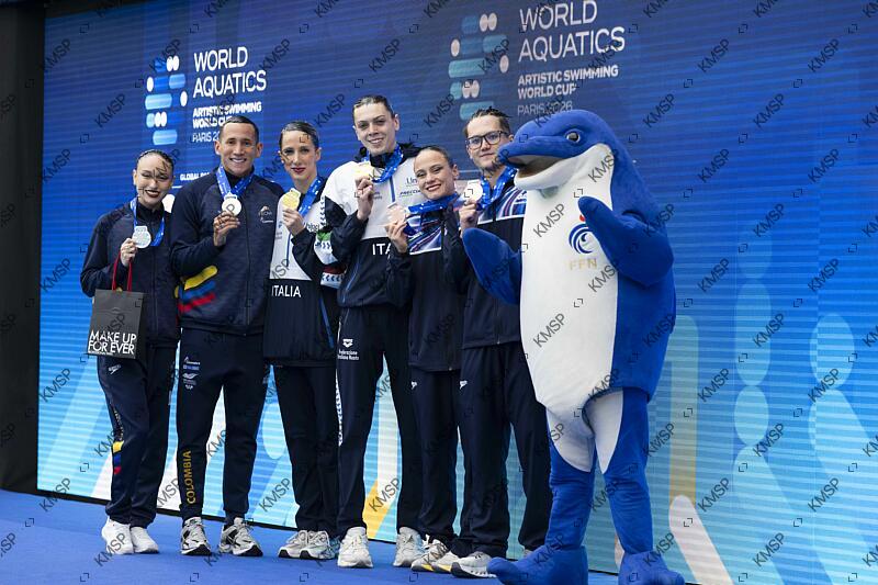 Emily Minante (COL) and Gustavo Sanchez (COL) Bronze medal, Filippo Pelati (ITA) and Lucrezia Ruggiero (ITA) Gold medal, Isabelle Thorpe (GBR) and Ranjuo Tomblin (GBR) Silver medal at the podium ceremony on Mixed Duet Free during the World Aquatics Artistic Swimming World Cup, at The Georges Vallerey in Paris,France on March 29, 2026, Photo Stephane Kempinaire / KMSP