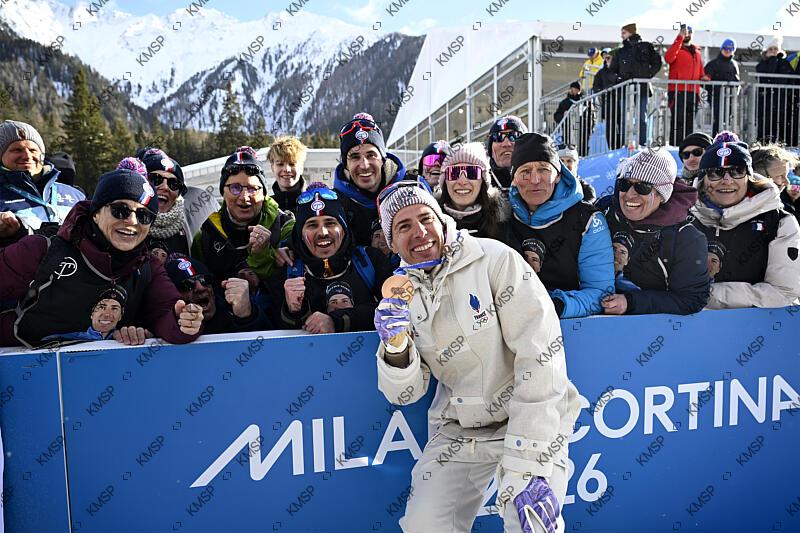Quentin Fillon Maillet (FRA) poses with his family with his Bronze medal in Men's Biathlon 12,5km Mass Start becoming the most decorated French athlete in history with nine Olympic medals during the Olympic Winter Games Milano Cortina 2026, at Anterselva Biathlon Arena, in Antholz-Anterselva, Italy, on February 20, 2026, Photo Jean-Marie Hervio / KMSP