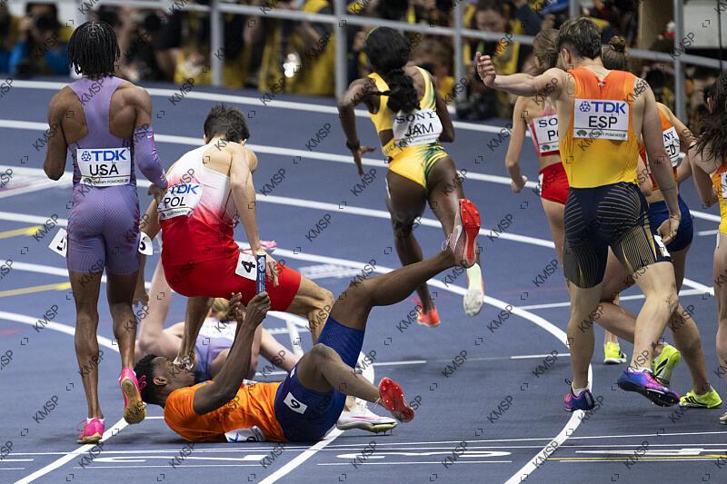 Crash on Mixed 4x400 m Relay during the World Athletics Indoor Championships in Torun, Poland, on March 21, 2026, Photo Stephane Kempinaire / KMSP