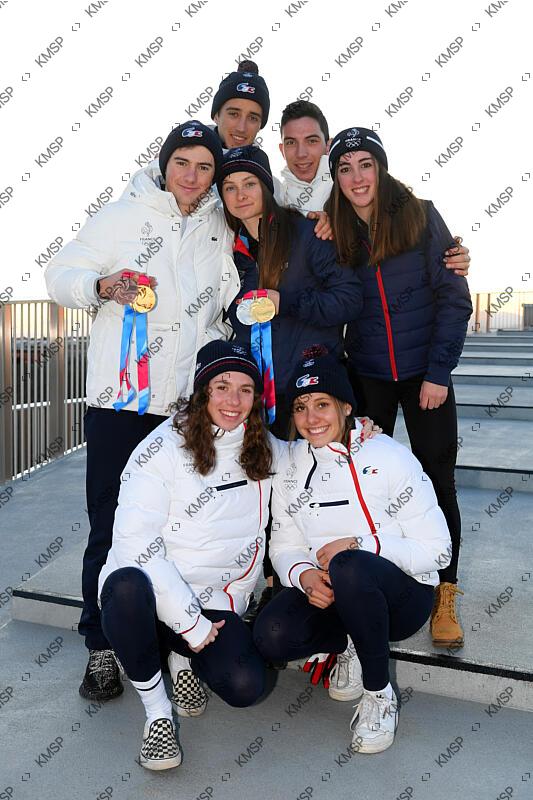 French Biathlon team Fany Bertand, Leonie Jeannier, Mathieu Garcia, Jeanne Richard, Chloe Bened, Theo Guiraud-Poilot, Lou Thievin pose during Youth Winter Olympic Games 2020 , at Lausanne, Switzerland, on January 15, 2020, Photo Philippe Millereau / KMSP