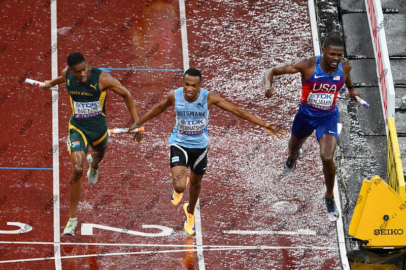 Zakithi Nene (RSA) wins the bronze medal, Busang Collen Kebinatshipi (BOT) wins the gold medal, Rai Benjamin (USA) wins the silver medal in men’s 4x400m relay final during the World Athletics Championships Tokyo 2025, on September 21, 2025, at National Olympic Stadium, in Tokyo, Japan, Photo Philippe Millereau / KMSP