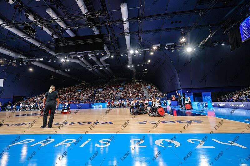General view in Wheelchair Rugby Mixed Preliminary Round Group B match between France and Denmark during the Paralympic Games Paris 2024, at Champ-de-Mars Arena, in Paris, France, on August 29, 2024, Photo Fabien Boukla / KMSP