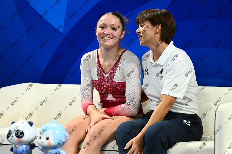 Candy Briere-Vetillard (FRA) and her coach Virginie Abadie in Trampoline Gymnastics, Women's Tumbling Final, in Chengdu, Republic of China, on August 09, 2025, Photo Philippe Millereau / KMSP