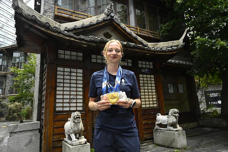 Marine Lefeuvre (FRA) poses with her medals won in Women's Roller Inline Speed Skating during the World Games 2025 at Chengdu Roller Sports Centre, in Chengdu, Republic of China, on August 16, 2025.. Photo Jean-Marie Hervio / KMSP