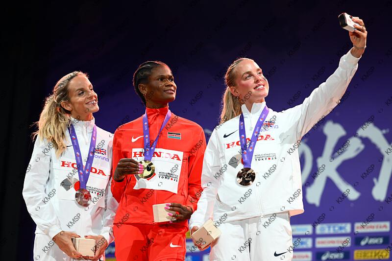 Lilia Odira (KEN) wins the gold medal, Georgia Hunter (GBR) wins the silver medal and Keely Hodgkinson (GBR) wins the bronze medal and takes a selfie on the podium during the World Athletics Championships Tokyo 2025, on September 21, 2025, at National Olympic Stadium, in Tokyo, Japan, Photo Philippe Millereau / KMSP