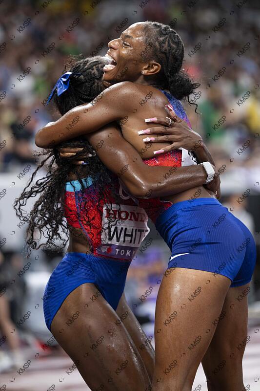 Melissa Jefferson-Wooden, Kayle White, Tanisha Terry and Sha’Carri Richardson (USA) celebrate the Gold medal on Women’s 4X100 m Relay final during the World Athletics Championships Tokyo 2025, on September 21, 2025, at National Olympic Stadium, in Tokyo, Japan, Photo Stéphane Kempinaire/ KMSP