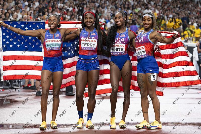 Melissa Jefferson-Wooden, Kayle White, Tanisha Terry and Sha’Carri Richardson (USA) celebrate the Gold medal on Women’s 4X100 m Relay final during the World Athletics Championships Tokyo 2025, on September 21, 2025, at National Olympic Stadium, in Tokyo, Japan, Photo Stéphane Kempinaire/ KMSP