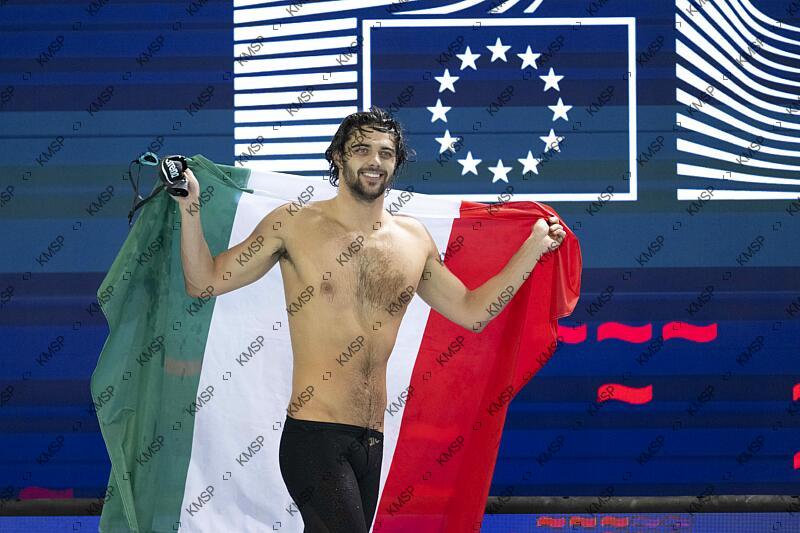 Thomas Ceccon (ITA) celebrates his Gold medal on Men’s 100 m Backstroke final during the European Aquatics Swimming Short Course Championships, at the Aqua Lublin Center in Lublin, Poland, on December 5, 2025. Photo Stephane Kempinaire/KMSP