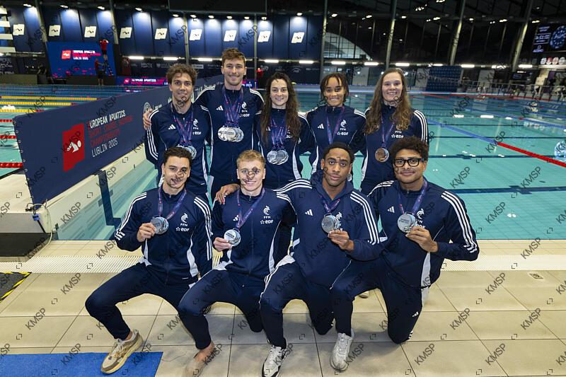 Mewen Tomac, Maxime Grousset, Beryl Gastaldello, Analia Pierre, Pauline Mahieu, Clement Secchi, Lucien Vergnes, Jeremie Delbois and Yohann Ndoye-Brouard (FRA) pose with their medals at the end of the competition during the European Aquatics Swimming Short Course Championships, at the Aqua Lublin Center in Lublin, Poland, on December 7, 2025. Photo Stephane Kempinaire/KMSP