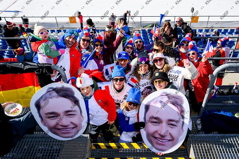 French fans react prior the Biathlon Mixed Relay 4x6km during the Olympic Games Milano Cortina 2026, at Anterselva Biathlon Arena, in Antholz-Anterselva, Italy, on February 08, 2026, Photo Lionel Hahn / KMSP