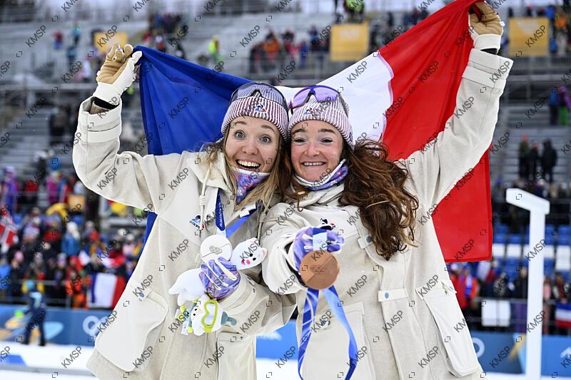 Oceane Michelon (FRA, Silver) and Lou Jeanmonnot (FRA, Bronze) celebrate their medals won in Women's Biathlon 7,5km Sprint during the Olympic Winter Games Milano Cortina 2026, at Anterselva Biathlon Arena, in Antholz-Anterselva, Italy, on February 14, 2026, Photo Jean-Marie Hervio / KMSP