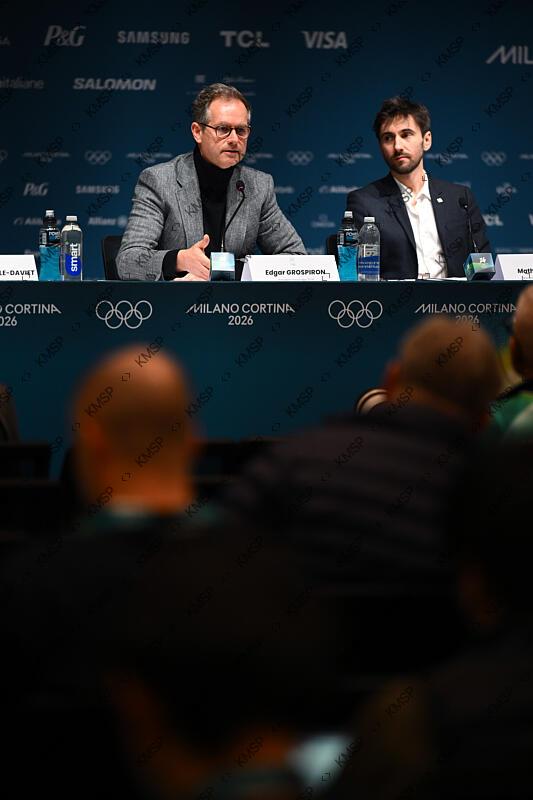 Edgar Grospiron (FRA), President of French Alps 2030 OCOG and Mathieu Sakkas (FRA), Branding Director of French Alps 2030 OCOG, during the French Alps 2030 Press Conference, on February 21, 2026, at Main Press Centre, Milano, Italy, Photo Philippe Millereau / KMSP