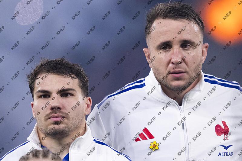 Antoine Dupont and Anthony Jelonch during the National Anthem before the Six Nations Rugby Union match France against Italy at the Stade Pierre Mauroy, in Lille, on February 22, 2026, Photo Stephane Kempinaire / KMSP