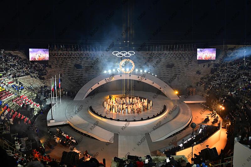 Musicians, choir members and athletes perform during the flag handover ceremony at the Closing Ceremony of the Olympic Winter Games Milano Cortina 2026, at Verona Olympic Arena, in Verona, Italy, on February 22, 2026, Photo Vincent Curutchet / KMSP