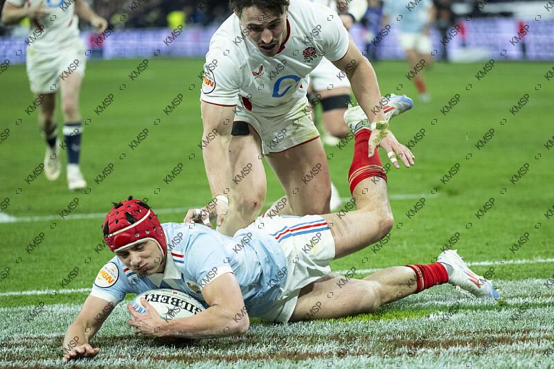 Louis Bielle-Barrey (FRA) competes and scores a try during the Six Nations Rugby Union match France against England at the Stade de France, in Saint-Denis on March 14, 2026, Photo Stephane Kempinaire / KMSP
