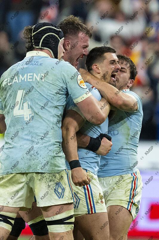 Thomas Ramos (FRA) celebrates the victory at the end of the Six Nations Rugby Union match France against England at the Stade de France, in Saint-Denis on March 14, 2026, Photo Stephane Kempinaire / KMSP