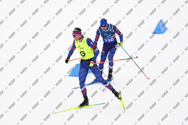 Florian Michelon (FRA) and Anthony Chalencon (FRA) compete in the Para Cross-Country Skiing Men's 20km Interval Start Free Vision Impaired during the XIV Paralympic Winter Games Milano Cortina 2026 at Tesero Cross-Country Skiing Stadium, on March 15, 2026, in Val di Fiemme, Italy, Photo Cedric Lecocq / KMSP