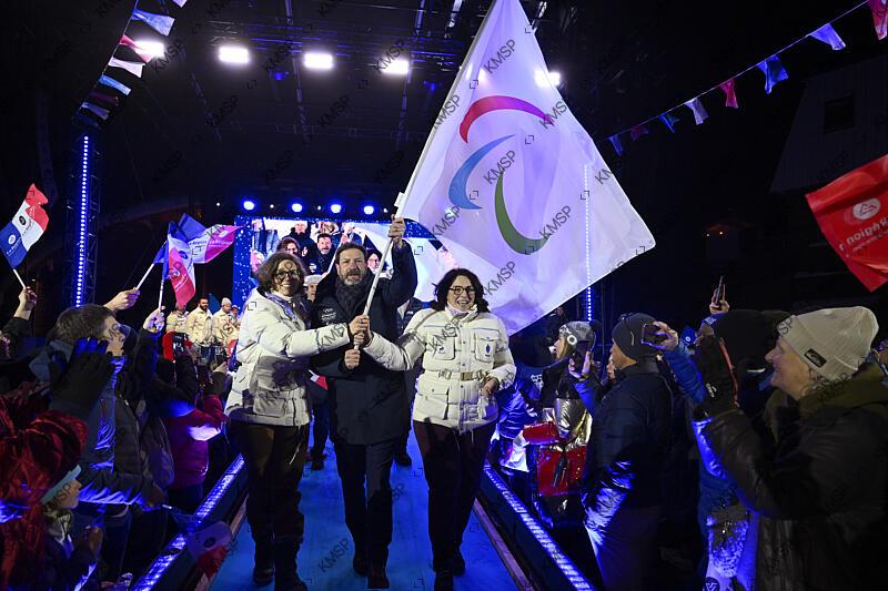 Camille Galliard-Minier (Minister Delegate in charge of Autonomy and Persons with Disabilities), Fabrice Pannekoucke (President of the Auvergne-Rhone-Alpes Region) and Marina Ferrari (Minister for Sport, Youth and Associative life) wave the Paralympic flag during the return of the French delegation from the Paralympic Winter Games Milano Cortina 2026, in Chamrousse, France, on March 16, 2026, Photo Jean-Marie Hervio / KMSP
