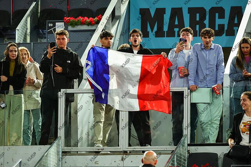 French supporters celebrate Arthur Fils (FRA) victory after he won the men's quarter final of the ATP Masters 1000, Mutua Madrid Open en la Caja Magica, on April 29, 2026, Madrid, Spain. Photo Clement Mahoudeau / KMSP